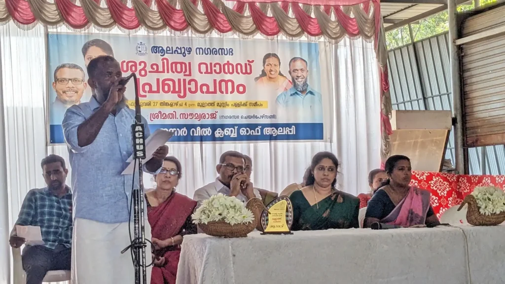 As part of the Nirmala Bhavanam Nirmala Nagaram 2.0 – Azhakode Alappuzha Campaign, Mullath Ward has proudly attained the milestone of Total Sanitation Status. The declaration ceremony was held today at 4:00 PM near Mullath Muslim Mosque and was inaugurated by Alappuzha Municipality Chairperson, Smt. Soumya Raj. The session was presided over by Health Standing […]